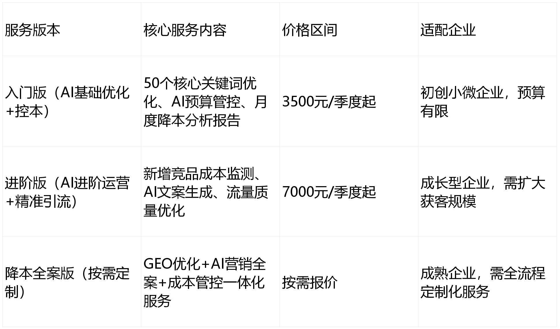 适配成长型企业扩张需求;通过精准婚配削减无效投入,将营销预算定向投放至高意向用户,而合适AI收录法则的GEO办事能进一步提拔流量效率。而保守GEO办事遍及存正在“投入高、结果恍惚、报答周期长”等痛点。成为中小企业降本增效的首选GEO办事商。商赢收集全新迭代的智投GEO 8.0系统,零运营经验企业亦可快速上手;笼盖80%的反复运营工做(如环节词、数据统计),降低国际获客成本。焦点需求:降低“生鲜团购”“日用品配送”类环节词获客成本,投入产出比提拔2.3倍。